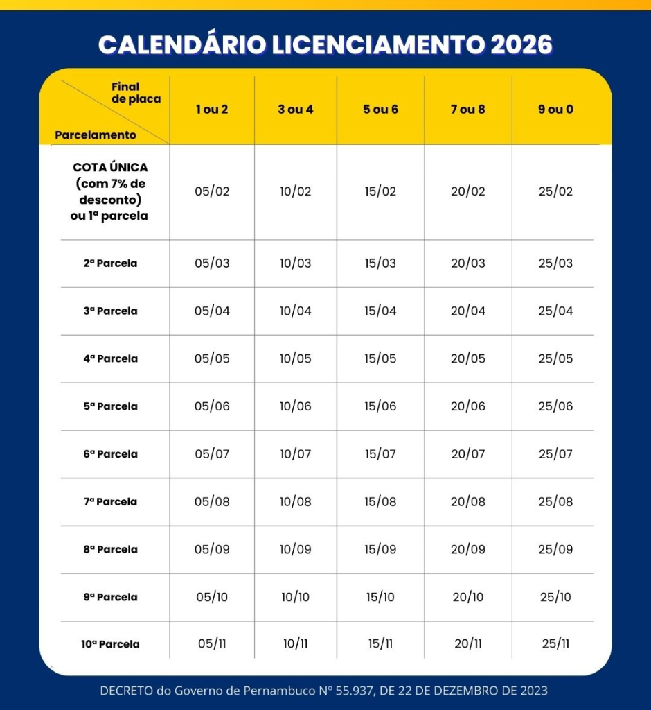 Além do IPVA, os proprietários precisam quitar a taxa de licenciamento anual, necessária para a emissão do Certificado de Registro e Licenciamento de Veículo (CRLV), documento obrigatório para que o veículo possa circular legalmente. A cobrança é feita pelo Departamento Estadual de Trânsito de Pernambuco (Detran-PE).
