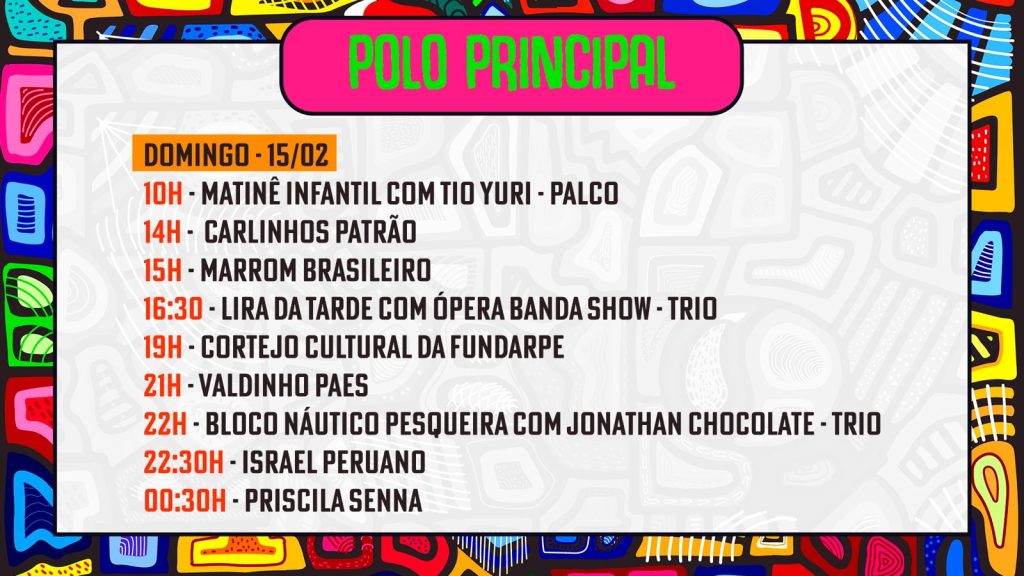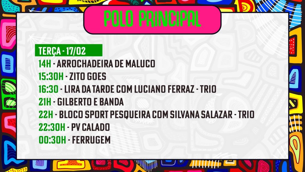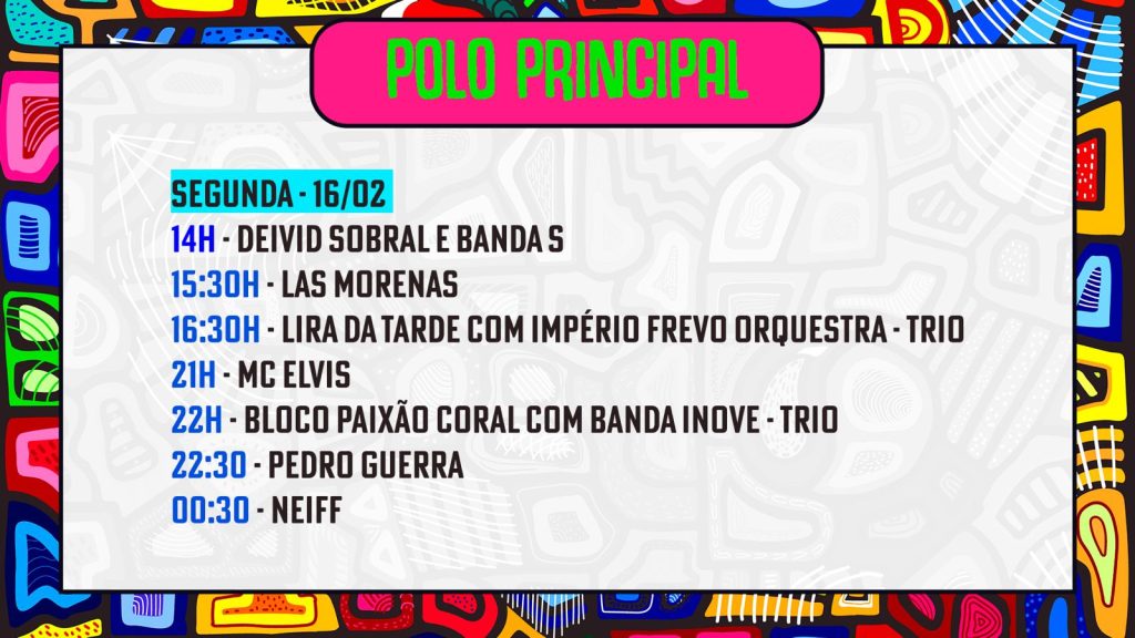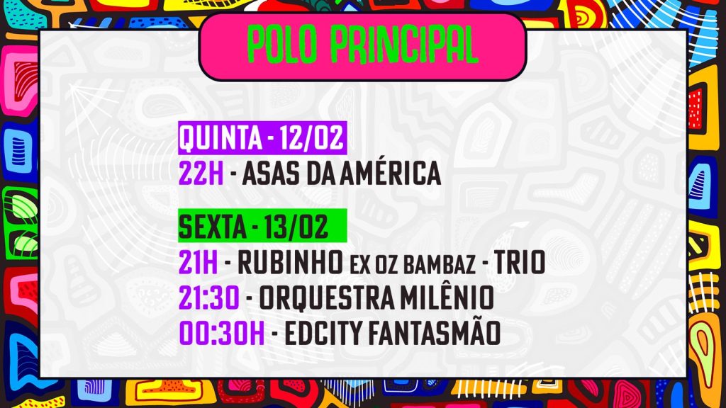 No Palco Principal, a agenda reúne grandes nomes da música e blocos tradicionais entre 12 e 17 de fevereiro, com atrações como Asas da América, Elba Ramalho, Avine Vinny, Marrom Brasileiro, Priscila Senna, MC Elvis, Neiff e Ferrugem, além de cortejos culturais, matinê infantil e apresentações de orquestras e trios elétricos.