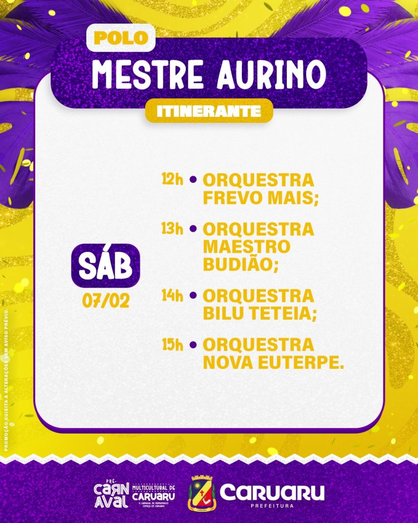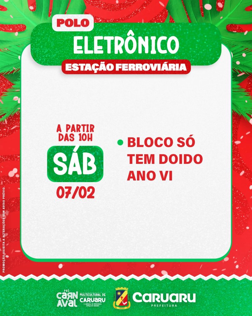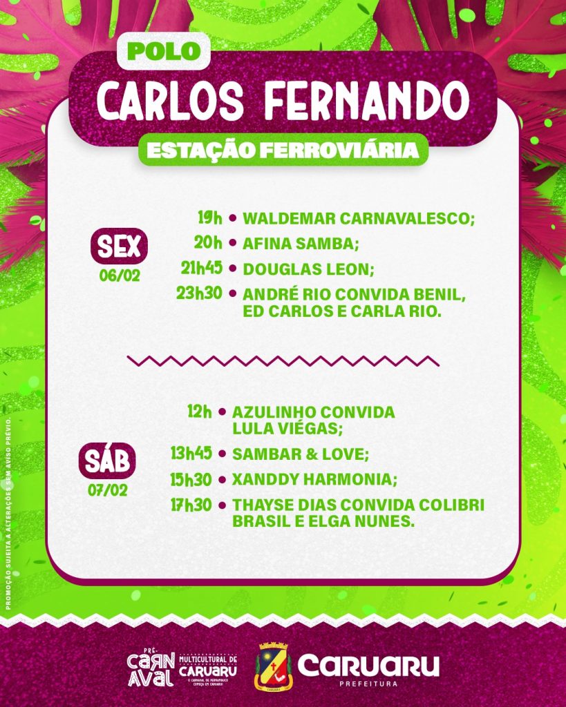No primeiro dia, as apresentações têm início às 19h, no Polo Estação, com shows de Afina Samba, Douglas Leon e André Rio, que recebe Benil e Ed Carlos. Já no sábado (7), a festa ganha ainda mais força com polos simultâneos e o Circuito Aldo Teixeira, que levará cortejos e apresentações culturais para as ruas do centro.