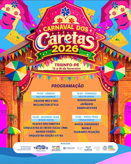 A Prefeitura de Triunfo anunciou a programação oficial do Carnaval dos Caretas 2026, uma das festas mais tradicionais e esperadas do município. Neste ano, o evento será realizado nos dias 13 a 18 de fevereiro.